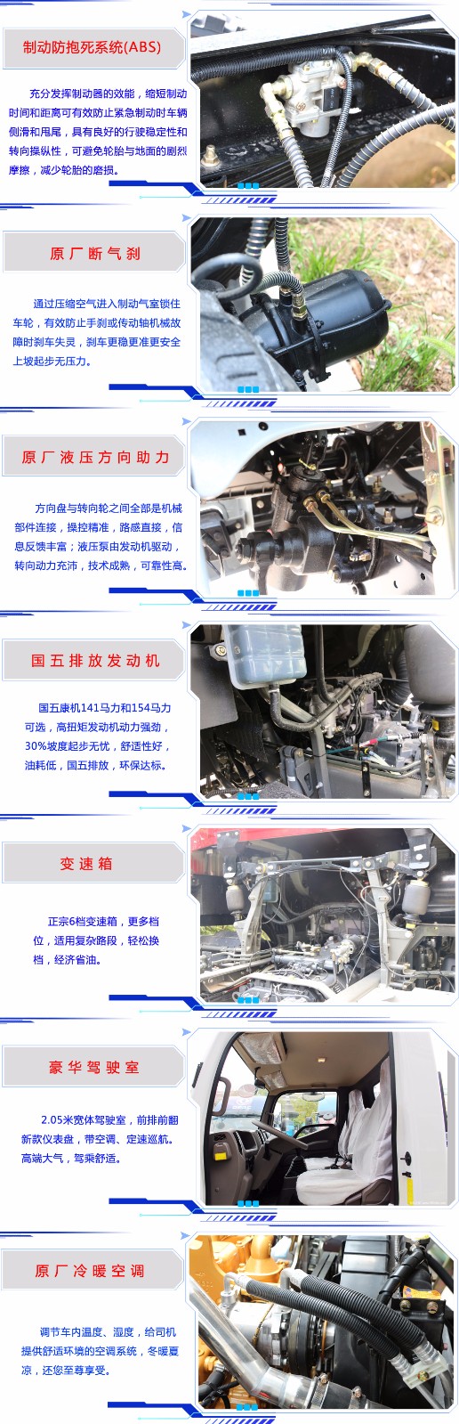 底盤(pán)配置:該車才用福田康明斯154馬力發(fā)動(dòng)機(jī)(歐五排放標(biāo)準(zhǔn)帶尿素罐),6檔手動(dòng)變速箱,3800mm軸距,7.50R16鋼絲胎,氣剎,帶冷熱空調(diào),帶離合器助力,帶方向助力,帶定速巡航功能,2.05米寬體駕駛室。總質(zhì)量:7噸,車身自重4.8噸。
