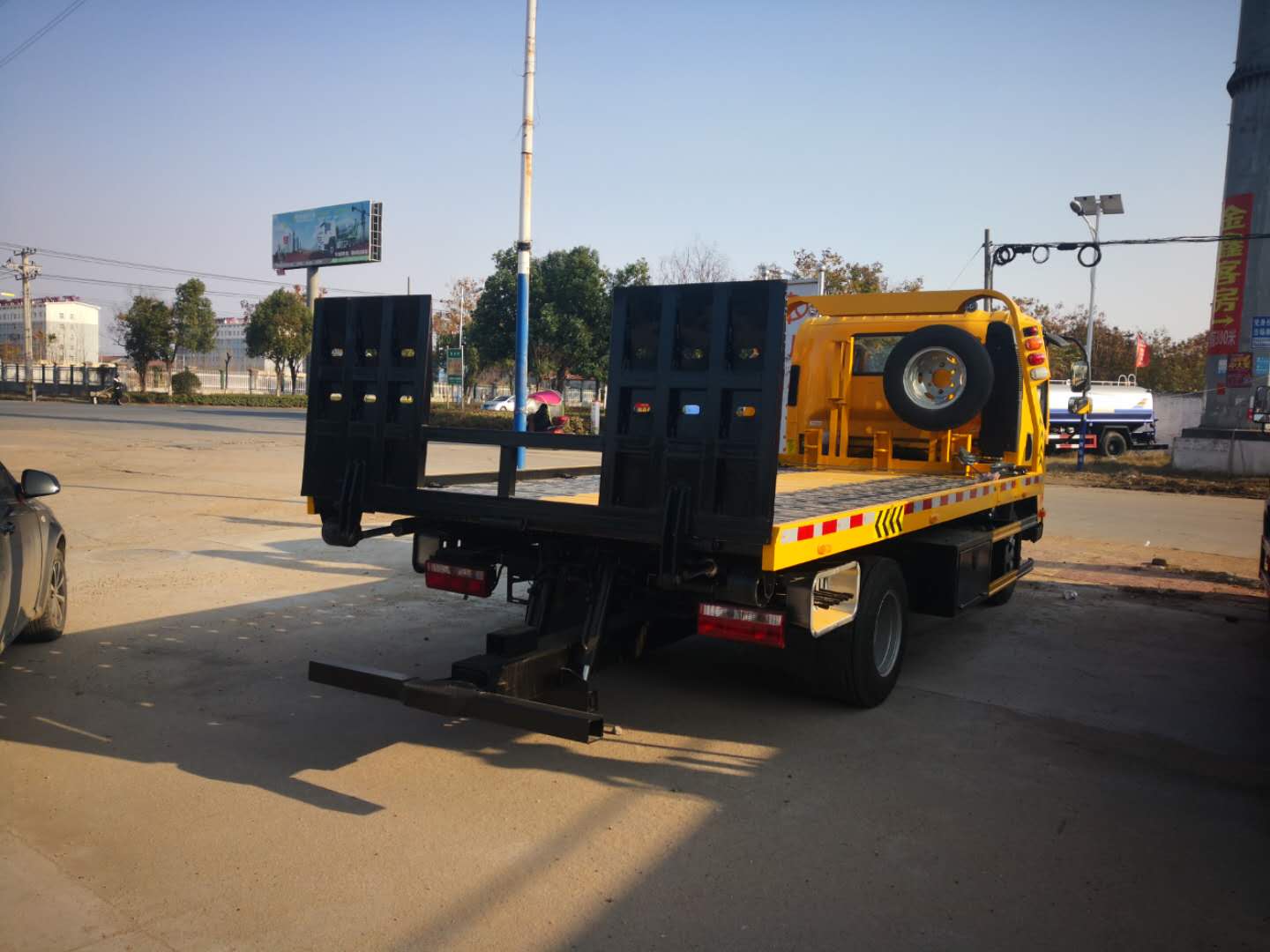上裝配置:采用德國技術折疊沖壓式平板,平板長4.2米,寬2.3米,雙側聯動操作裝置,配后工作燈2只,一個4噸液壓絞盤,帶21米鋼絲繩,一個工具箱,一個洗手箱,配2個小車,4根捆綁帶,L型抱胎架一對,加液壓伸縮式**板(1.1米),注:藍牌一拖二清障分為尾部翻轉和尾部伸縮兩種,尾部翻轉板可根據客戶要求定做中間加長板(加長0.5米,整板長達到4.7米(不包含尾部翻轉1米))