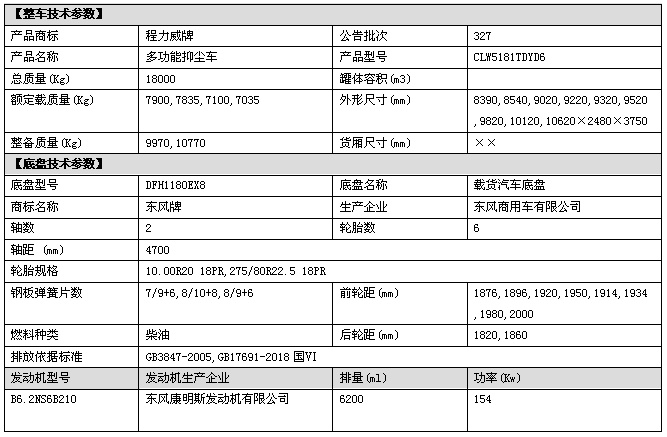 采用東風公司原裝底盤,國六排放標準,康明斯210馬力發動機,4700mm軸距,275真空胎,空調,電動玻璃,前橋4.5噸,后橋9噸,東風6檔變速箱。